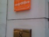 Easy Office London office sign bright orange corporate branded sign. reversely printed detail fitted to raised mounted 10 mm glass look acrylic panel.