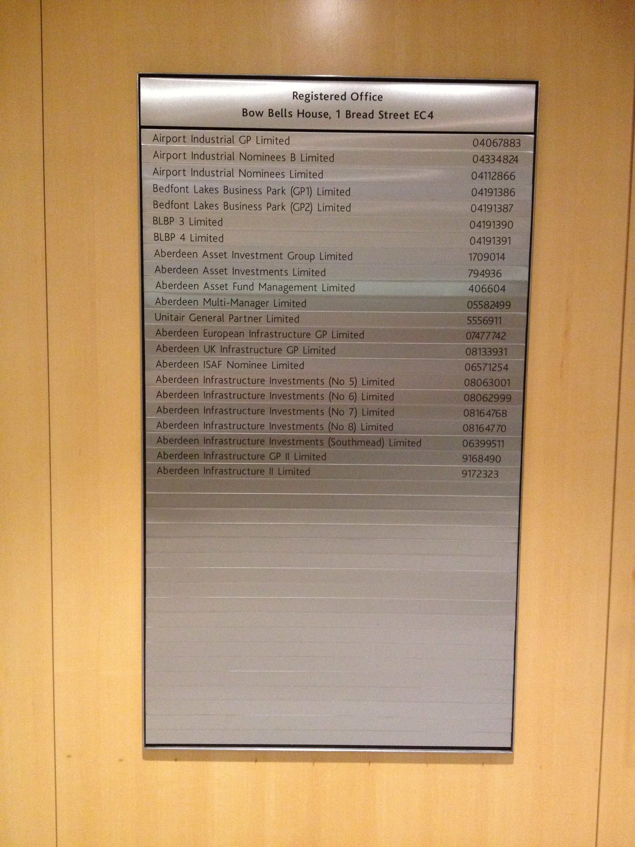 City of London Registered Office Sign List of company names sign board in stainless steel at entrance to company offices. Corporate SignsReception signsMetal SignsDirectory and modular signsDoor SignsOffice Signs Share this sign