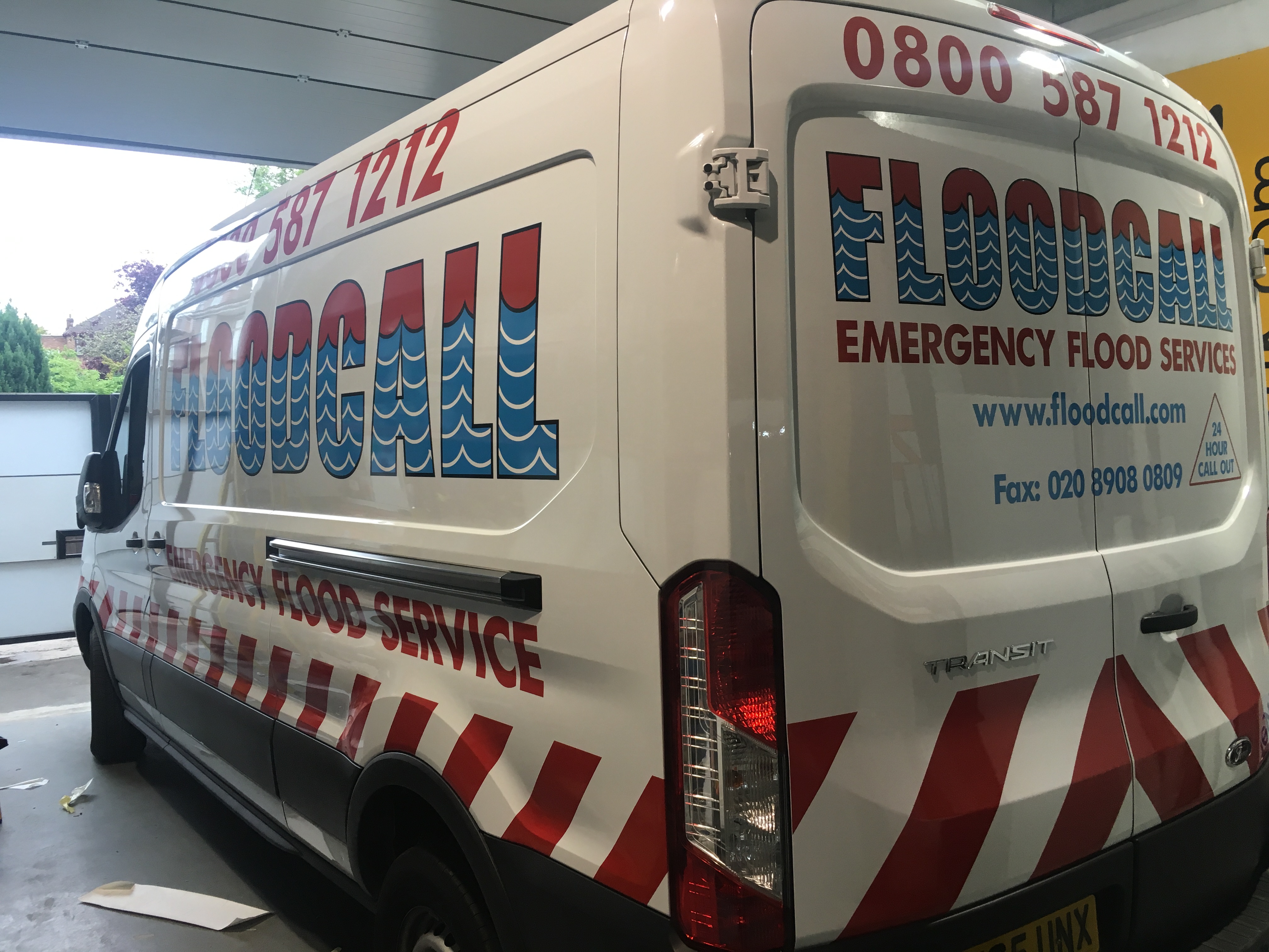 Emergency Response Vehicle Graphics Emergency response van with cut out vinyl graphics in three colours. Red chevron van graphics on the rear portion for London Flood Services company. Vehicle GraphicsVan Signs Share this sign