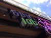 Neon logo sign in pink neon for small market restaurant in London, features moulded neon and illuminated back-lit letters.