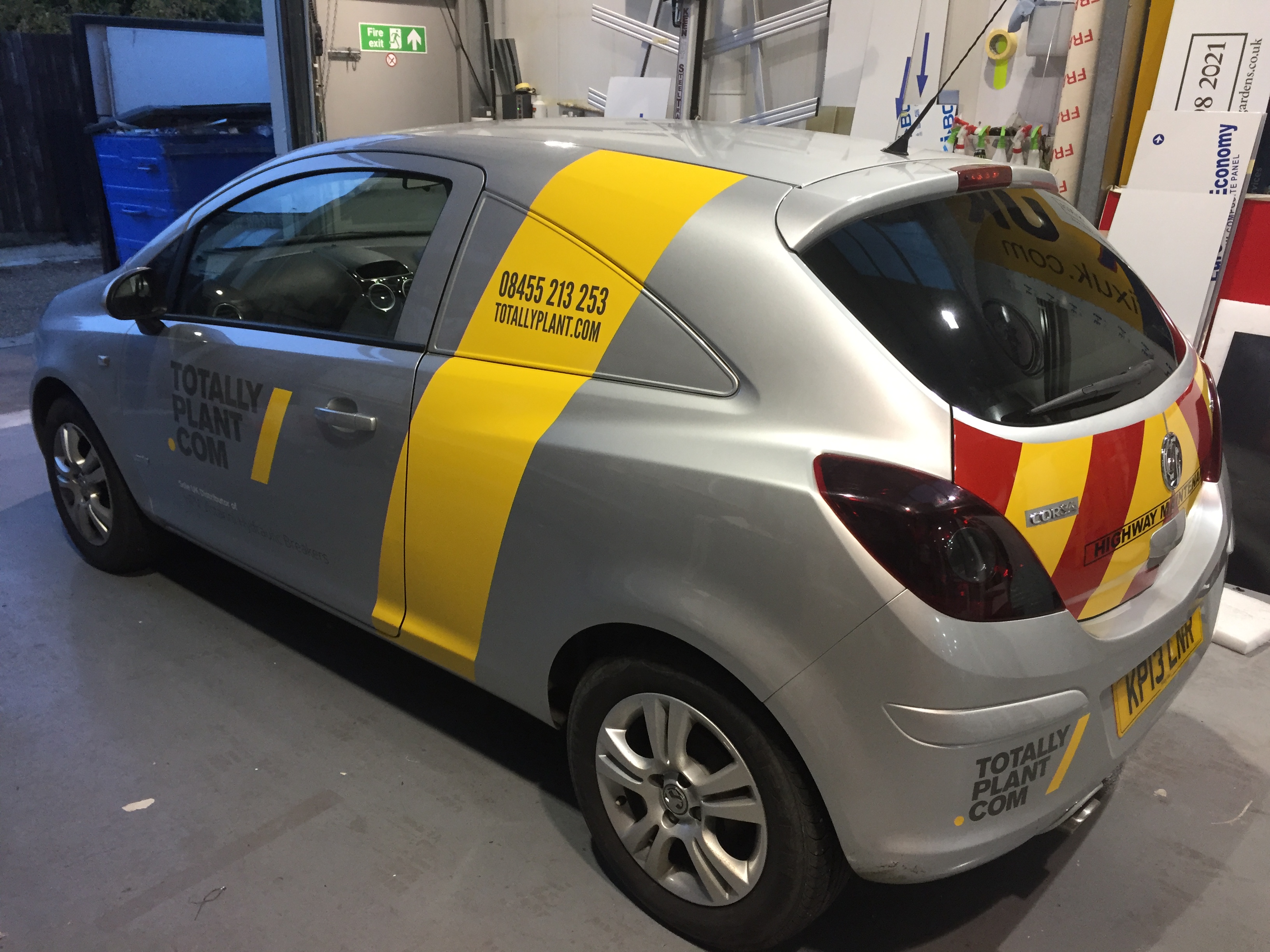 Totally plant small van graphics with iconic yellow branded stripe The vehicle graphics Bold yellow stripe wrapped around front and rear of the van to and corporate colours. red and yellow chevrons added to back. Plant and HaulageVan SignsChevron Share this sign