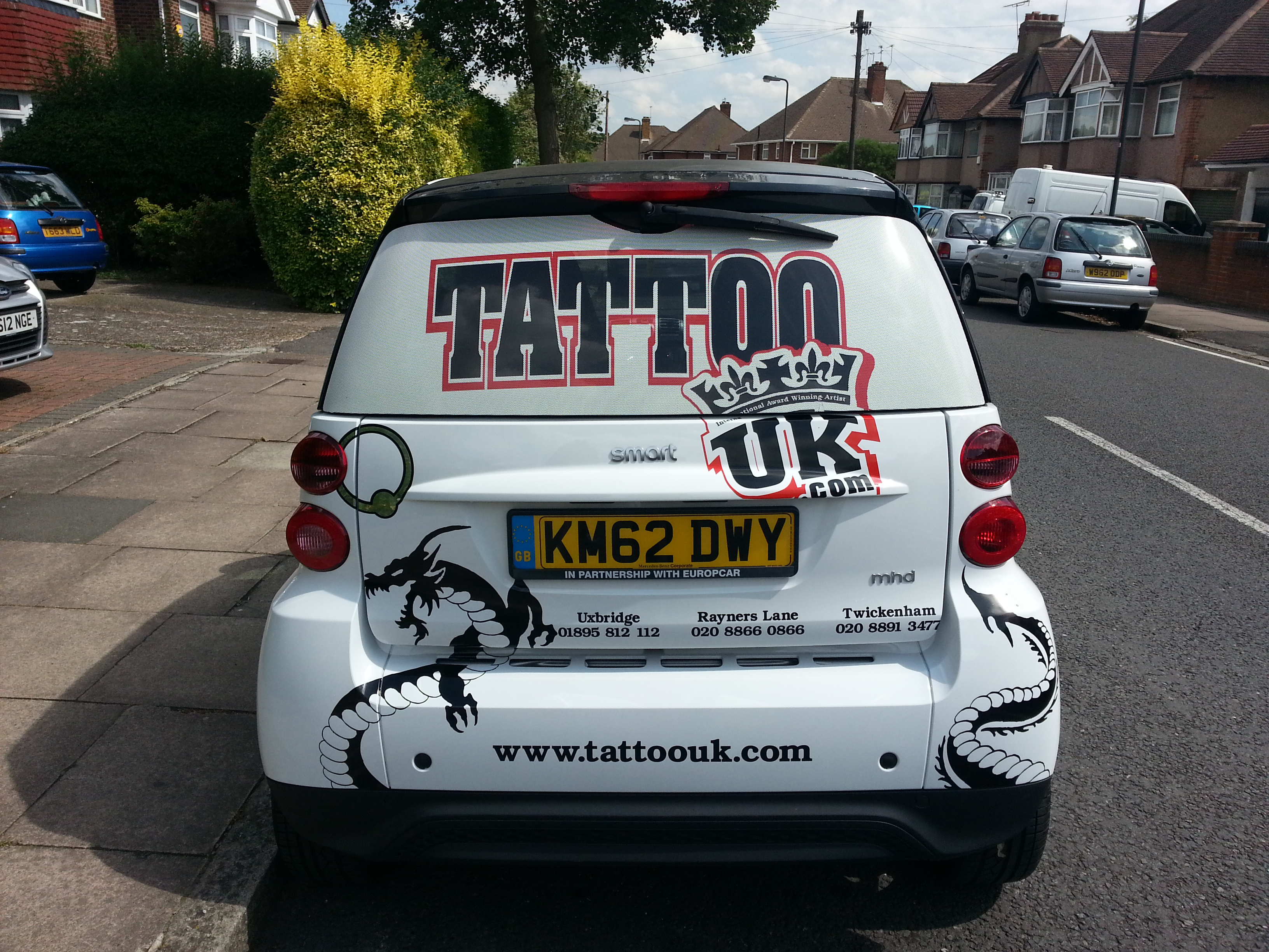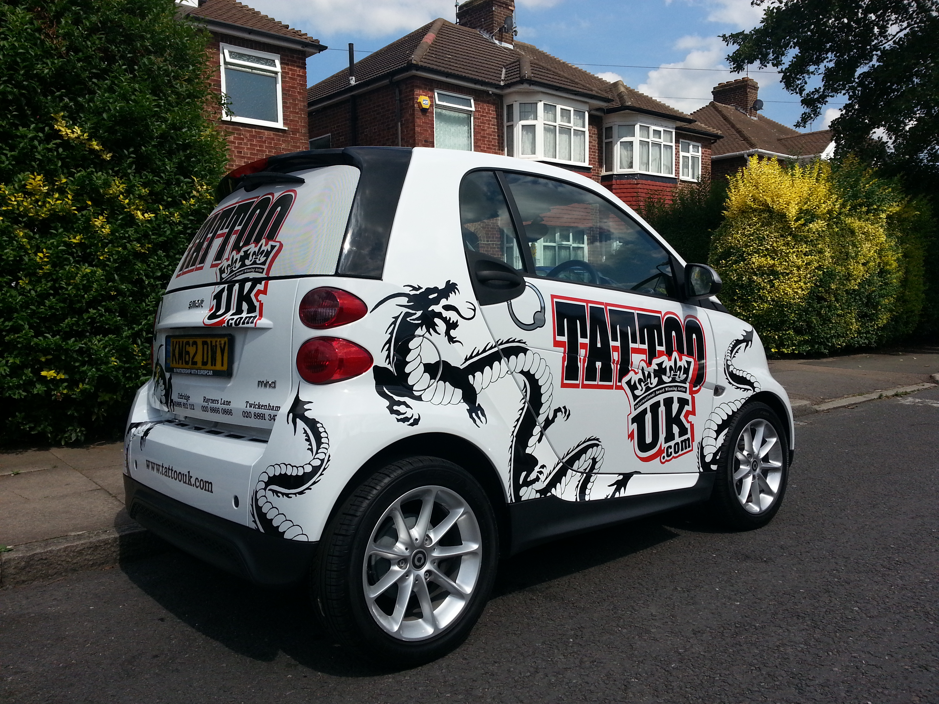 Smart car wrapped with vehicle graphics (including graphics across the rear window which uses a 'contra-vision' screen that allows for signage on the outside whilst the driver can still see clearly out of the rear window).